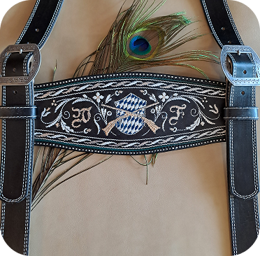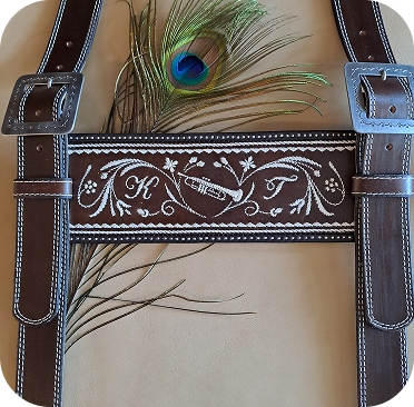 Hosenträger sind an sich nur wichtig zum Hosenheben, wenn man ihn aber mit Federkielstickerei verziert, wird er zur Visitenkarte seines Trägers. Ob man sich sein Zunftzeichen, Monogramm oder Familienwappen einsticken lässt, kann viel über den Besitzer aussagen.