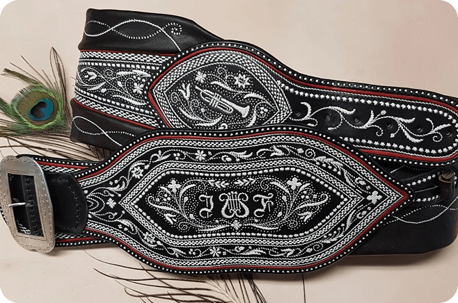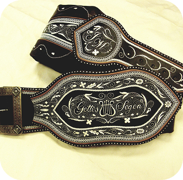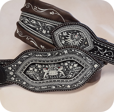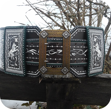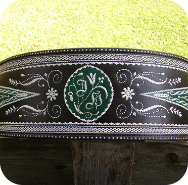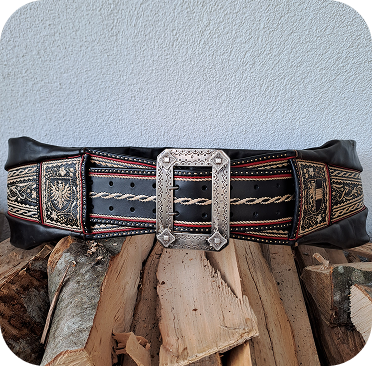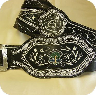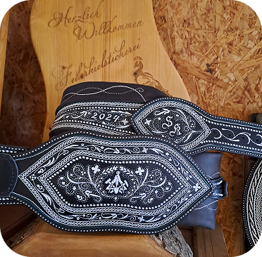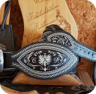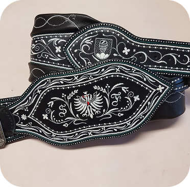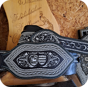 Großbauern ließen sich breite Gürtel, ihrem Stand entsprechend, mit Federkielstickerei verzieren. Handwerker bevorzugten ihre Zunftzeichen oder Erzeugnisse.Oft konnte so ein Prachtranzen den Gegenwert von 4 Kühen übersteigen und war somit wichtig für die soziale Stellung des Trägers (Hinweis: Wir nehmen keine Kühe mehr in Zahlung).